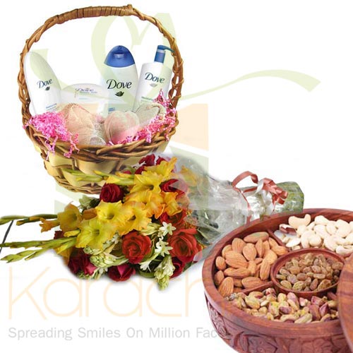 Dove Basket, Flowers And Dry Fruits: Delight your loved ones with this elegant gift basket featuring a charming dove motif, along with fresh flowers and a selection of delectable dry fruits, perfect for expressing your warmest wishes on any occasion.